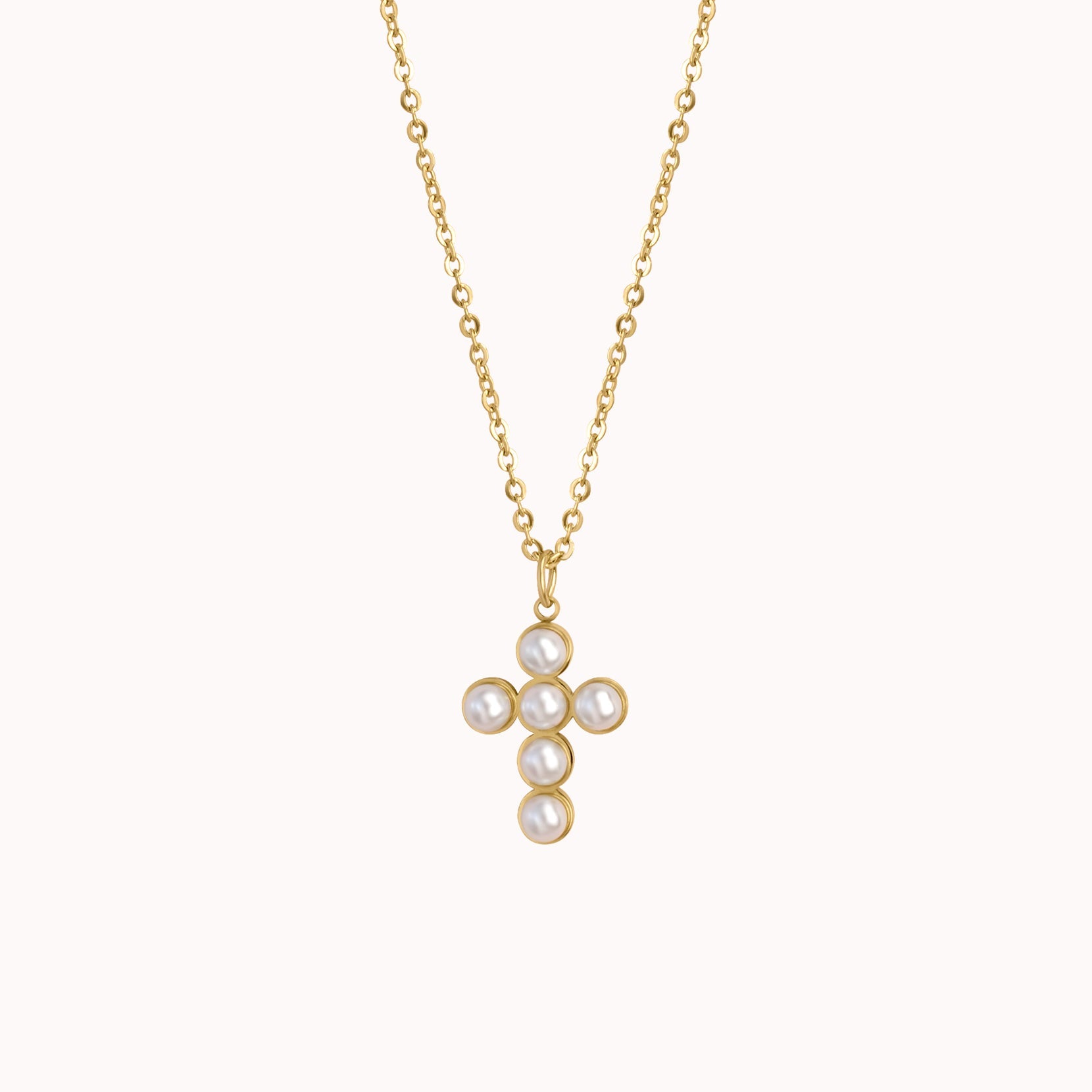 The Pearl Cross Necklace is a timeless piece with a modern, feminine twist. Featuring a beautiful cross-shaped pendant adorned with luminous pearls, this necklace exudes elegance and grace. Perfect for layering or wearing solo, it’s a meaningful accessory that adds a touch of sophistication to any look, whether casual or formal.